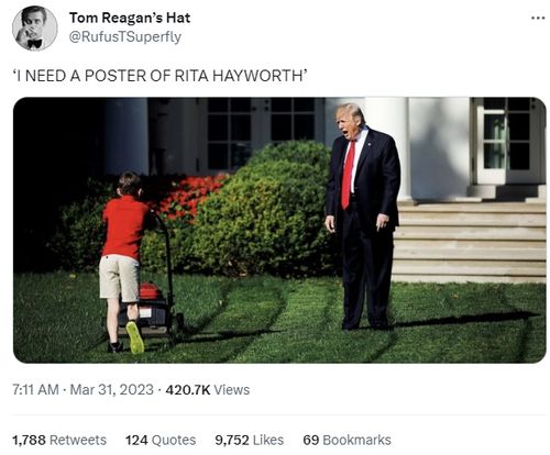 한 트위터 사용자는 트위터에 트럼프 전 대통령이 백악관에서 잔디를 깎고 있는 소년을 향해 소리 치는 것처럼 보이는 사진과 함께 "나는 리타 헤이워스의 포스터가 필요해!"라는 글을 올렸다.
