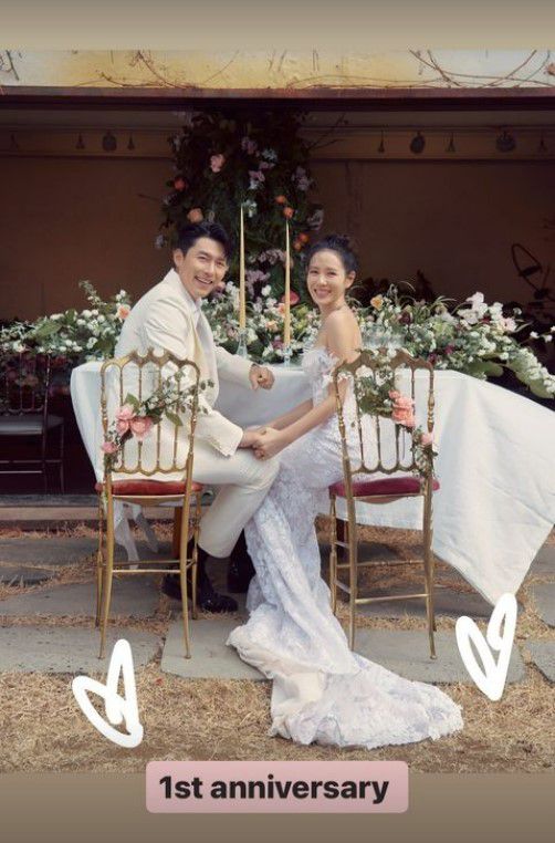 손예진은 31일 개인계정에 "1st anniversary"라는 문구와 함께 남편 현빈과 찍은 웨딩사진을 올렸다. 사진에서 두 사람은 손을 맞잡고 환하게 미소 짓고 있다.