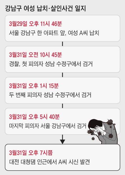 납치범들은 이 여성을 데리고 곧장 대전 방향으로 차를 몰았다. 이 과정에서 A씨를 납치했을 때 쓴 현대차 벨로스터 차량을 대전 인근에 버리고 렌터카로 갈아탔다. 그 뒤 충북 청주로 향했고, 청주에서 렌터카도 버리고 택시를 이용해 경기 성남시로 이동했다. 성남에 도착한 이들은 옷을 갈아입고 근처 숙박 업소에 잠시 들어간 것으로 알려졌다. 경찰은 이들이 수사기관의 추적을 의식해 치밀한 준비를 한 것으로 보고 있다.