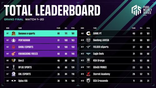 31일 다나와는 '2023 펍지 위클리 시리즈(이하 PWS)' 페이즈1 그랜드 파이널 마지막 날 세 번의 치킨을 차지하고 토털 포인트 191점을 기록. 압도적인 차이로 다른 팀들과 격차를 벌리며 우승을 차지했다.