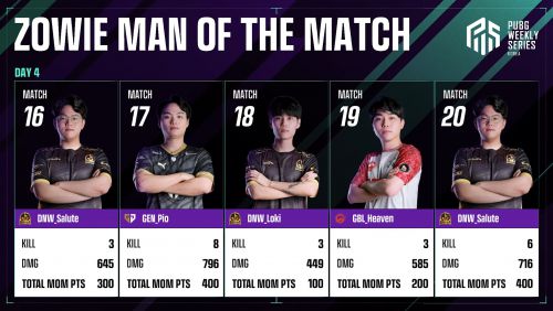 우승컵을 눈앞에 둔 다나와는 4일차 첫 경기에서 치킨을 챙기며 1위 자리를 재탈환했다. 펜타그램과 기블리가 뒤를 바짝 쫓아왔지만 한번 기세를 올린 다나와를 잡아낼 수 없었다. 4일차 15킬을 포함해 세 번의 치킨을 챙기며 리더보드 최상단에 이름을 올리고 우승 트로피를 들어 올렸다.