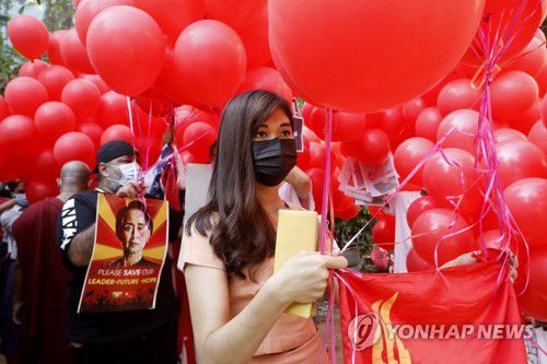 미얀마 시위에 항상 등장하는 NLD의 상징인 붉은색과 수치 고문의 사진 |