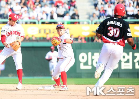 8회초 무사 1, 2루에서 SSG 최주환 2루수가 KIA 황대인의 타구를 직접잡아 병살로 연결시키고 있다.