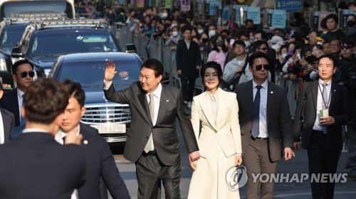 오후 4시25분께 행사장 근처에 도착한 윤 대통령은 안전 울타리 너머의 시민들과 악수하고 손을 흔들어 인사하면서 행사장으로 향했다. 김 여사는 한발짝 정도 뒤에서 윤 대통령을 따라갔다.