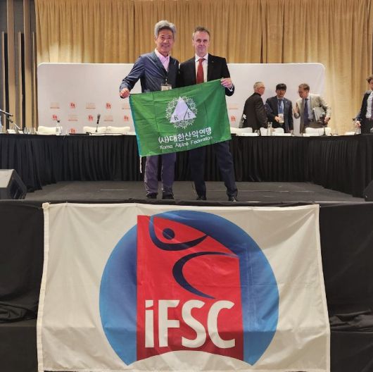 싱가포르에서 열린 국제스포츠클라이밍연맹 총회에서 대한산악연맹이 '2025 IFSC 서울 스포츠클라이밍 세계선수권대회' 유치에 성공한 뒤, 손중호(왼쪽) 회장이 마르코 스콜라이 IFSC 회장과 기념 촬영을 하고 있다. [대한산악연맹 제공] |