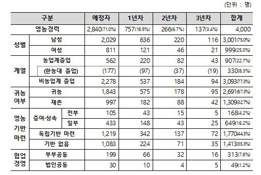 또한, 비농업계 졸업생은 3093명(77.3%)으로 농고·농대 등 농업계 학교 졸업생 907명(22.7%)의 약 3.4배 수준이다. 귀농인이 2691명(67.3%)으로 재촌 청년 1309명(32.7%)의 2.1배로 나타나는 등 이다. 농식품부 관계자는 “이 사업을 통한 청년들의 신규 유입이 상당 수준 이루어지고 있는 것으로 보인다”고 했다.