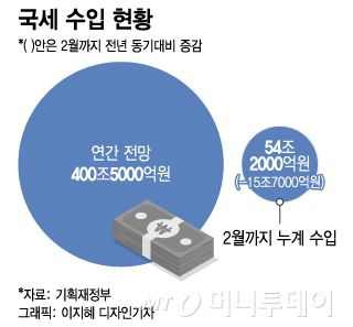 2일 기획재정부에 따르면 올해 2월까지 국세 수입은 54조2000억원으로 1년 전 같은 기간보다 15조7000억원 감소했다.