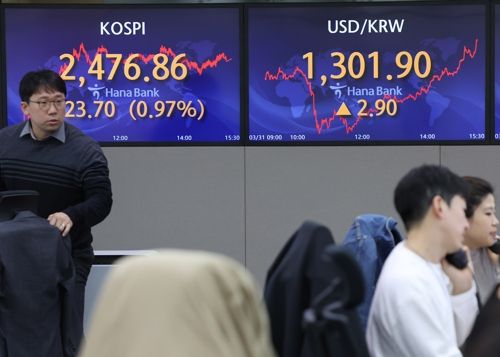 31일 오후 서울 중구 하나은행 본점 딜링룸에서 직원들이 업무를 보고 있다. [사진 제공 = 연합뉴스] |