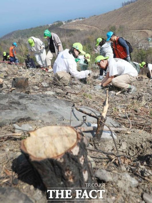 [더팩트ㅣ이효균 기자] 유한킴벌리가 1일 강원도 동해시에서 ‘2023 우리강산 푸르게 푸르게 신혼부부 나무심기’ 행사를 연 가운데 신혼부부 110쌍이 지난해 동해 산불 피해 지역에서 산벚나무와 소나무를 심고 있다.