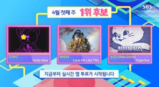 이날 공개된 4월 첫째 주 1위 후보는 스테이씨(STAYC) 'Teddy Bear'(테디베어), 엔믹스(NMIXX) 'Love Me Like This', 뉴진스(New Jeans) 'Hype boy'(하입 보이)가 이름을 올렸다.