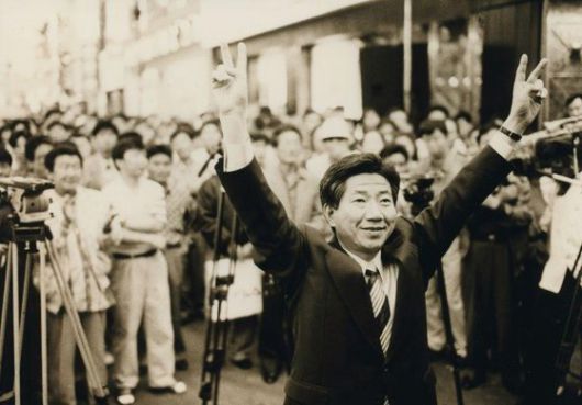 1995년 6월 제1회 전국동시지방선거에서 부산시장 선거에 출마한 노무현 전 대통령이 유권자들에게 둘러싸인 채 양손을 들어올려 승리의 브이자를 만들어 보이고 있다. 노무현 사료관 홈페이지 |
