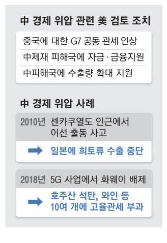 2일 니혼게이자이신문(닛케이)에 따르면 미국은 G7 회원국에 뜻을 같이하는 국가·지역에서 중국의 경제적 위압에 공동 대처하기 위해 실무급 협의를 요청했다. 특히 이 문제를 올해 5월 히로시마에서 열리는 G7 정상회의의 주요 의제로 상정하자고 요청하고, 의장국 일본과 협의를 진행하고 있다. 중국은 자국의 거대한 경제력을 외교 카드로 이용하는 움직임을 강화해왔다. 중국은 2010년 중·일 영유권 분쟁 지역인 센카쿠열도(중국명 댜오위다오) 인근에서 어선 출동 사고가 발생해 양국 관계가 나빠지자 일본에 희토류 수출을 중단한 바 있다. 또 호주 정부가 2018년 미국과 보조를 맞춰 5세대(5G) 통신망 사업에서 화웨이 참여를 배제하자 중국은 호주산 석탄과 와인, 소고기, 보리 등 10여 개 제품에 고율 관세를 부과했다.