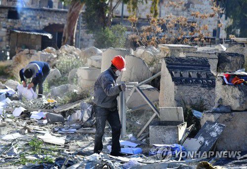 이스라엘 미사일 피격 현장서 잔해 치우는 시리아 주민들 |