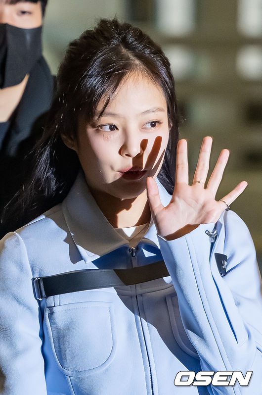 [OSEN=인천공항, 민경훈 기자]걸그룹 블랙핑크(BLACKPINK) 제니, 지수, 리사가 2일 오후 해외 일정차 인천광역시 중구 운서동 인천국제공항을 통해 미국 라스베이거스로 출국했다. 블랙핑크 제니가 출국길에 손인사를 하고 있다. 2023.04.02 / rumi@osen.co.kr