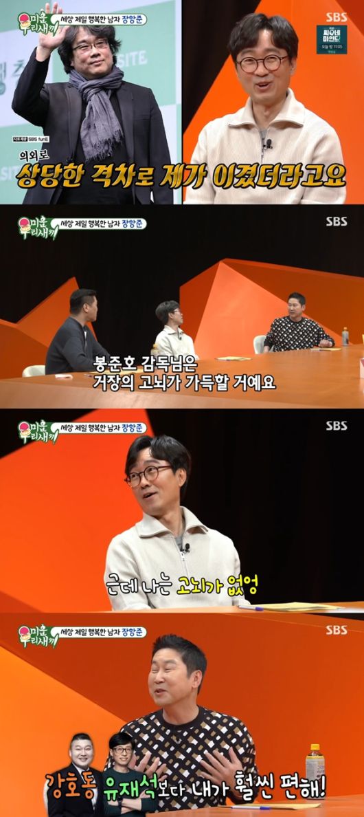 2일 방송된 SBS ‘미운 우리 새끼’에 장항준 감독이 출연했다. 장항준 감독은 최근 이뤄진 ‘봉준호로 살기 VS 장항준으로 살기’에 대한 설문 결과를 언급했다. 장항준 감독은 봉준호 감독을 이겨 화제를 모았다.