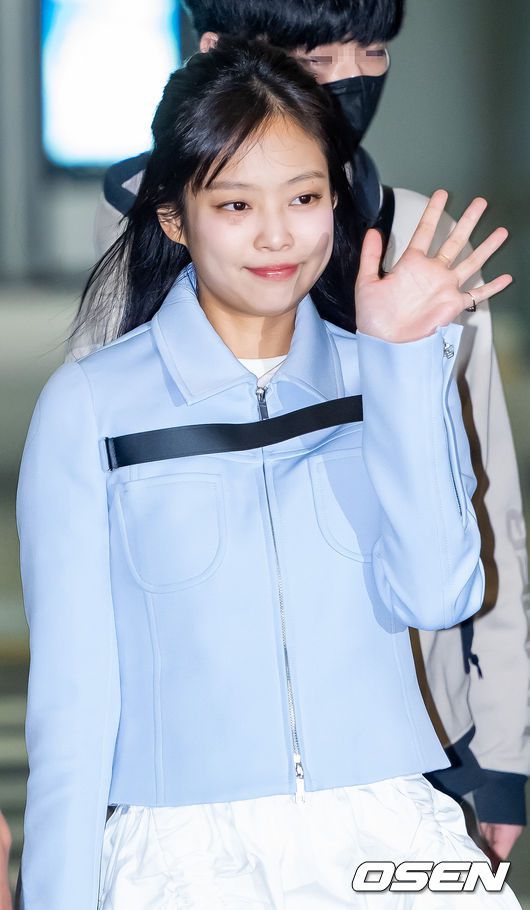[OSEN=인천공항, 민경훈 기자]걸그룹 블랙핑크(BLACKPINK) 제니, 지수, 리사가 2일 오후 해외 일정차 인천광역시 중구 운서동 인천국제공항을 통해 미국 라스베이거스로 출국했다. 블랙핑크 제니가 출국장으로 향하며 손 인사를 하고 있다. 2023.04.02 / rumi@osen.co.kr