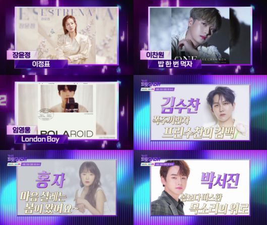 여기에 장윤정의 '이정표'가 새로운 1위 후보로 선정됐다. 또한 최근 군 제대를 알리며 컴백한 김수찬과 남승민, 홍자의 신곡 무대가 펼쳐진다.