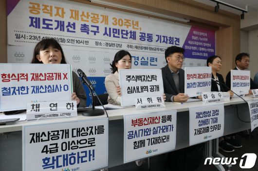 (서울=뉴스1) 민경석 기자 = 경제정의실천시민연합(경실련) 등 시민단체 관계자들이 3일 오전 서울 종로구 경실련에서 열린 '공직자 재산공개 30년, 제도개선 촉구 시민단체 공동 기자회견'에서 구호를 외치고 있다. 경실련은 이날 "1993년 공직자 재산공개가 시작된 이후 30년이 지났지만 공직자들의 투기 의혹은 계속해서 불거져 나오고 있다"면서 "공직자 재산등록 및 공개제도의 내실화를 위한 제도개선을 촉구한다"고 밝혔다. 2023.4.3/뉴스1