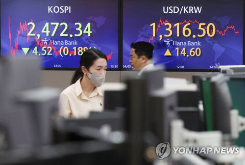 (서울=연합뉴스) 채새롬 기자 = 코스피가 3일 국제유가 급등 부담에 소폭 하락해 2,470대에서 마감했다. 원/달러 환율은 14.6원 급등했다.