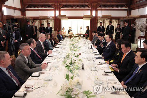 (서울=연합뉴스) 정아란 기자 = 윤석열 대통령이 3일 '2030 세계박람회' 개최 후보지인 부산 실사 차 방한한 국제박람회기구(BIE) 인사들을 청와대 상춘재로 초청, 만찬을 함께했다.