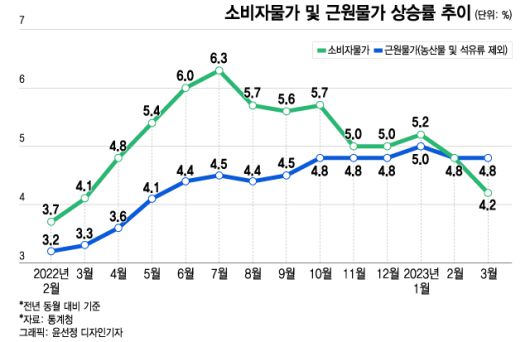 통계청이 4일 발표한 '2023년 3월 소비자 물가동향'에 따르면 3월 소비자물가지수는 110.56으로 전년동월 대비 4.2% 상승했다. 지난해 3월(4.1%) 이후 1년 만에 가장 낮은 상승폭이다.