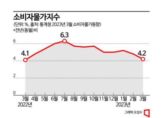통계청이 4일 발표한 ‘3월 소비자물가동향’에 따르면 지난달 소비자물가상승률은 전년동월대비 4.2% 상승했다. 지난달 상승률 4.8%보다 0.6%포인트 낮아졌다. 상승률은 지난해 3월(4.1%)이후 12개월 만에 가장 낮은 수치다. 지난해 5월(5.4%), 6월(6.0%), 7월(6.3%)까지 치솟았던 높은 물가 수준이 하반기 이후 조금씩 완화되는 양상이다.