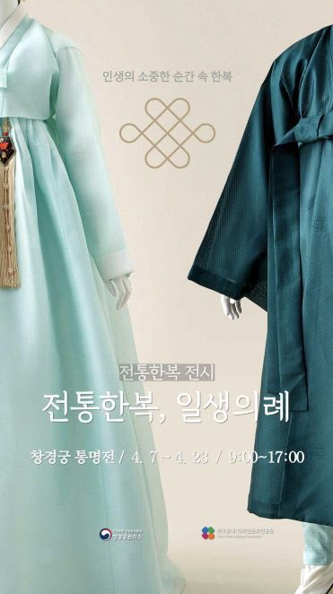 먼저 한국공예·디자인문화진흥원과 함께 오는 4월 7일부터 23일까지 창경궁 내 통명전에서 전통한복의 가치를 확산하기 위한 ‘전통한복, 일생의례’ 전시를 개최한다. 이번 전시에서는 어른이 되는 순간을 기념하는 관례·계례, 짝을 만나는 혼례, 장수를 축하하는 수연례, 조상을 기억하는 제례복 등 일생의례 관련 전통한복 10종을 선보인다. 5인의 한복 디자이너(김인자, 유현화, 이춘섭, 이혜순, 조은아)가 참여했다. 전시품은 한국공예·디자인문화진흥원과 한국실크연구원이 개발한 한복 원단을 활용해 제작했다.