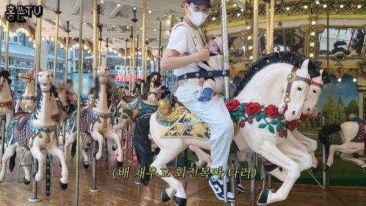회전목마를 탄 후 가족은 휴식을 취했다. 제이쓴은 “짬뽕 먹어야 된다고 해서 억지로 소화시키는 중이다. 아까 햄버거 괜히 먹었다”며 “중식당 진짜 맛있는 거 알지?”라고 물었다. 하지만 홍현희는 “몰라. 연애 초라서 샐러드 먹었던 거 같다”고 답했다.