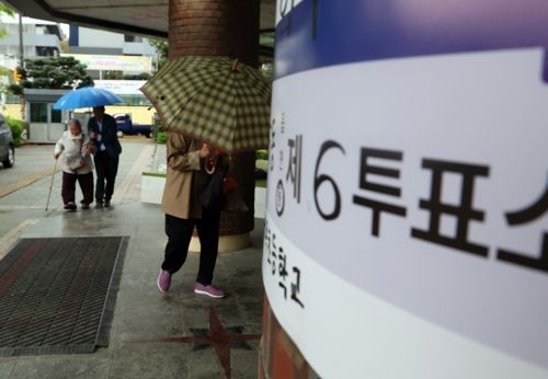 5일 전북 전주시 완산구 제6투표소가 마련된 서곡초등학교에 유권자가 우산을 쓰고 들어서고 있다. [연합뉴스] |