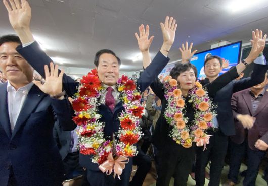 성낙인 경남 창녕군수 무소속 후보가 6일 오전 1시쯤 창녕군수 당선을 확정지은 후 부인과 함께 선거사무실에서 꽃다발을 목에 걸고 인사를 하고 있다. 연합뉴스 |