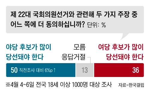 한국갤럽이 지난 4~6일 전국 18세 이상 1000명을 대상으로 조사한 결과 ‘현 정부를 지원하기 위해 여당 후보가 많이 당선돼야 한다’는 응답은 36%로 나타났고 13%는 의견을 유보했다.