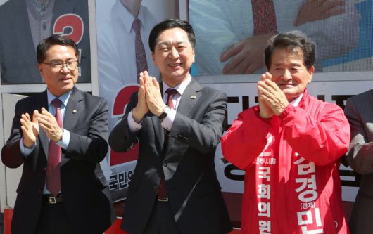 국민의힘 김기현 대표가 2일 전북 전주시 서부시장에서 전주을 국회의원 재선거 출마한 김경민 후보(오른쪽)를 지지 호소하면서 박수치고 있다. 왼쪽은 정운천 의원. 연합뉴스 |