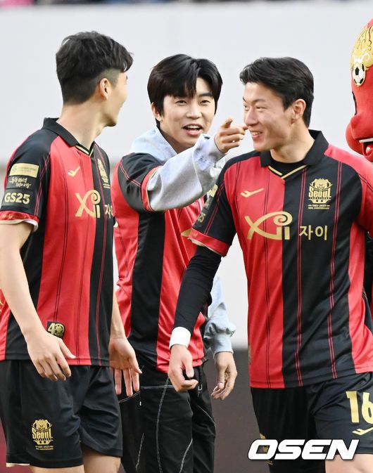 [OSEN=서울월드컵경기장, 민경훈 기자] 8일 오후 서울 상암월드컵경기장에서 '하나원큐 K리그1 2023' 6라운드 FC서울과 대구FC의 경기가 열렸다. 시축을 마친 가수 임영웅이 서울 기성용, 황의조와 즐겁게 얘기를 나누고 있다. 2023.04.08 /rumi@osen.co.kr