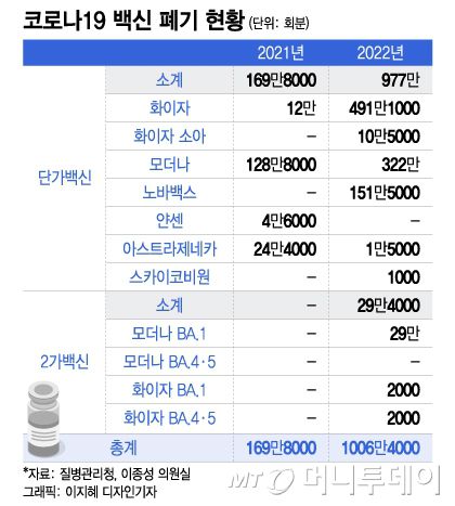게다가 정부는 구입한 백신 중 8.4%인 2200만2000회분을 폐기하거나 해외에 공여했다. 평균 구매 단가 적용 시 약 5800억원 규모다. 지난해까지 폐기한 코로나19 백신은 전체 구입 백신의 4.5%인 1176만2000회분으로 약 3100억원어치다.