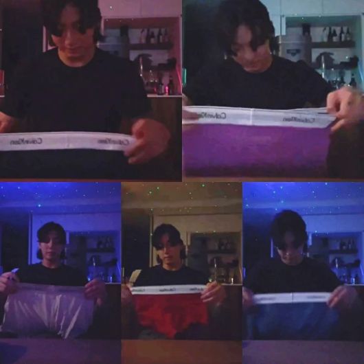이날 방송에서 정국은 자신이 글로벌 모델이자 앰배서더로 활동 중인 캘빈클라인(Calvin Klein) 언더웨어를 카메라에 비추며 등장 후 "전 오늘 온종일 빨래만 한 것 같다"고 밝혔다.