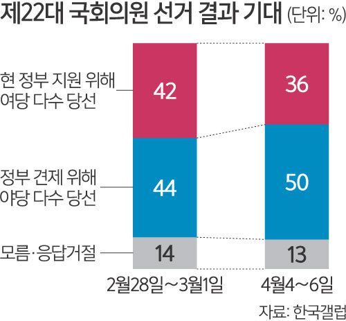 자연스레 내년 총선 표심 또한 현재까지는 정부 지원보다는 견제에 방점이 찍혀 있는 것으로 나타나고 있다. 같은 기간 진행한 한국갤럽 제22대 국회의원 선거 결과 기대 조사에서 ‘정부 견제 위해 야당 후보가 많이 당선돼야 한다’는 의견이 50%, ‘정부 지원 위해 여당 후보가 많이 당선돼야 한다’는 36%에 그쳤다. 직전 조사(2월28일∼3월1일 실시)에서 각각 44%, 42%를 기록했던 데 비해 그 격차가 더 벌어진 상황이다.