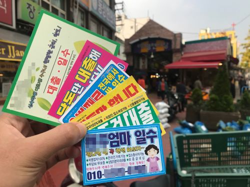 서울의 한 전통시장에서 발견된 대부업체들의 불법 명함형 전단들.(사진=정준영 기자) |
