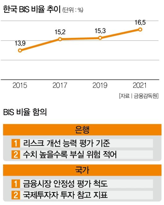 국가 전체로 따지면 한국은 2000년 이후 국제자본시장의 우량은행 평가 기준인 10% 이상의 BIS 비율을 유지하는 중이다. 2015년 13.91%였던 한국의 BIS 비율은 2018년 15.41%, 2021년 16.5%로 꾸준히 상승하며 개선세를 보이고 있다.