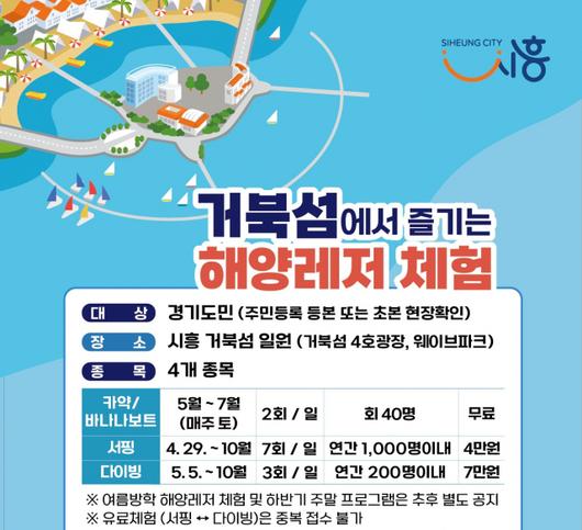 경기 시흥시는 오는 29일부터 ‘거북섬에서 즐기는 해양레저 체험’ 주제로 다양한 프로그램을 진행한다고 10일 밝혔다.