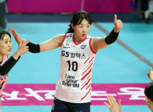 GS칼텍스 강소휘가 29일 열린 흥국생명과 원정 경기 도중 공격 성공 후 엄지를 추켜세우고 있다. 강소휘는 2023 VNL에 참가하는 여자배구대표팀 16인 로스터에 이름을 올렸다. [사진=발리볼코리아닷컴]