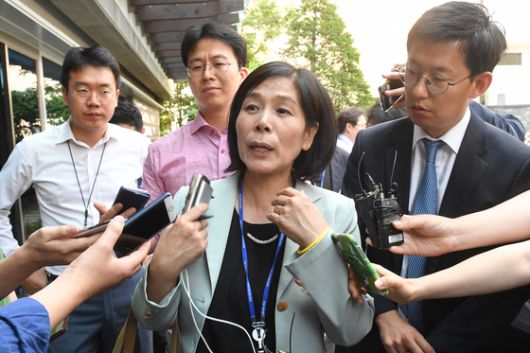 = 최민희 국정기획위 경제2분과 자문위원이 9일 오후 서울 종로구 금융감독원 연수원에 마련된 국정기획자문위원회에서 열린 '통신비 인하' 시민단체(참여연대, 경실련 등) 토론회를 마친 후 취재진의 질문을 받고 있다. 2017.6.9/뉴스1 |
