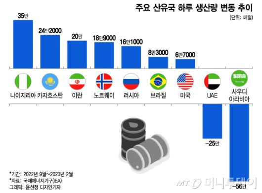 국제에너지기구(IEA) 집계에 따르면 지난해 9월부터 올해 2월까지 나이지리아의 하루 평균 원유 생산량은 35만배럴 늘었다. 카자흐스탄과 이란의 하루 산유량은 각각 24만2000배럴, 20만배럴 증가했다. 이는 OPEC+을 이끄는 사우디와 아랍에미리트(UAE)가 같은 기간 하루 산유량을 각각 56만배럴, 25만배럴 줄인 것과 대조적이다.