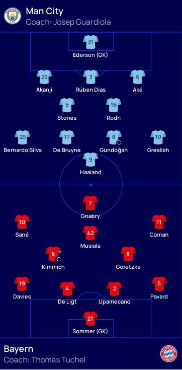 원정팀 뮌헨은 그나브리, 사네, 무시알라, 코망, 키미히, 고레츠카, 데이비스, 데 리흐트, 우파메카노, 파바르, 좀머가 출전한다. 포메이션은 4-2-3-1로 공개됐다.