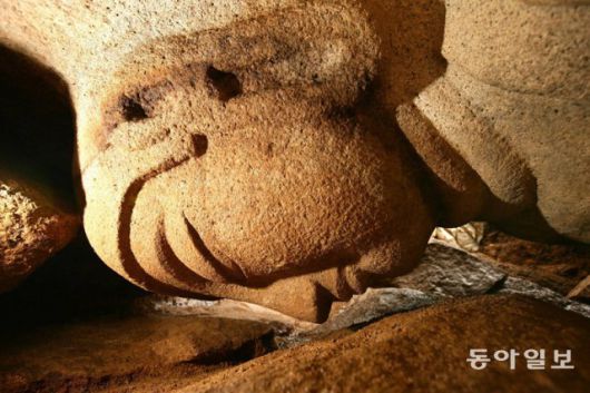 2007년 국립경주문화재연구소 소속 연구원들이 경북 경주 남산에서 열암곡 마애불입상 을 발견한 뒤 수습하고 있다(사진). 엎어진 불상과 바닥 사이 5cm 틈으로 온전하게 보존된 불상의 얼굴이 보인다. 국립문화재연구소 제공 |