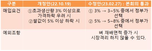 개정안은 정부가 공급 과잉으로 인한 쌀값 하락 시 민간의 쌀 재고를 매입(시장격리)하도록 하는 것이 핵심이다. 수정을 거친 양곡관리법 개정안은 지난 3월 23일 본회의에서 처리됐으나, 윤석열 대통령은 4월 4일 재정 부담 등을 이유로 재의 요구권을 행사한 바 있다.