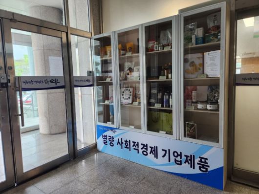 별량면은 고금리·고물가 등 경영 악화에도 사회적 가치 실현을 위해 고군분투하고 있는 지역의 사회적 경제 기업을 지원하고자 올해 초부터 방문객이 드나드는 청사 입구에 제품 전시장을 만들었다.