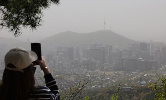 중국발 황사의 영향으로 12일 전국의 미세먼지 농도가 ‘매우 나쁨’ 수준을 보인 가운데, 한 시민이 서울 종로구 북악산에서 뿌옇게 흐려진 하늘 너머로 보이는 남산 타워를 휴대폰 카메라에 담고 있다. 신소영 기자 viator@hani.co.kr |