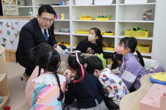 장상윤 교육부 차관이 2월 17일 오전 서울 용산구 청파유치원을 방문해 어린이들과 대화하고 있다. 연합뉴스 |