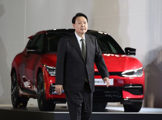 윤석열 대통령이 11일 경기도 화성시 기아 오토랜드 화성에서 열린 전기차 전용공장 기공식에서 축사를 마친 뒤 단상을 내려가고 있다. (사진=연합뉴스) |