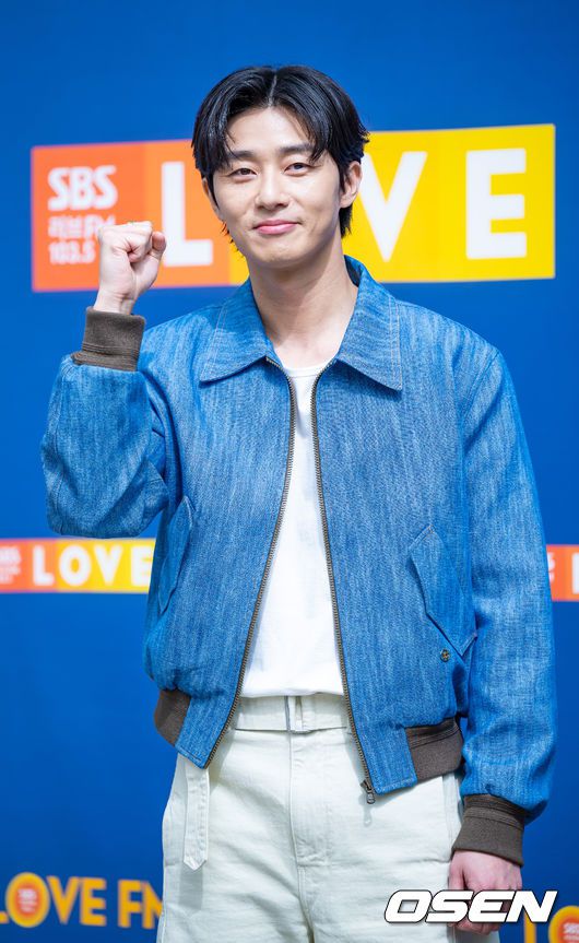 [OSEN=민경훈 기자] 13일 오후 서울 목동 SBS에서 SBS 라디오 파워FM '두시탈출 컬투쇼’가 진행됐다. 배우 박서준이 입장하며 취재진을 향해 포즈를 취하고 있다. 2023.04.13 / rumi@osen.co.kr
